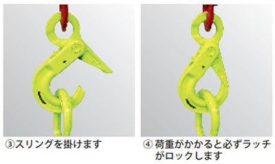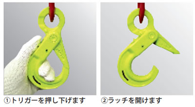 外開きの為、太いワイヤーやベルトの掛け外しが容易に行えます。 |