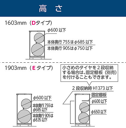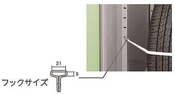 | ■特長 ●車2~4台分の収納力 最大でタイヤ12本までの収納が可能です。 棚板の替りにタイヤバー2本と転がり防止用フックが装備されています。 ●高さ調節可能 タイヤの大きさに合わせてタイヤバーを調節することができます。 ![]() ●転がり防止用フック付き 標準装備されているので、市販の紐を通すだけですぐに使用できます。 ![]() ![]() ![]() ![]() ![]() ■仕様