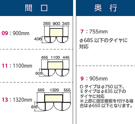 ストックタイヤの保管は、全面開口を活かしたタイヤ専用収納庫がおすすめです。 ●組立・据付・ブロック・アンカー工事別途。 |
