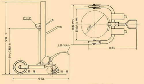 | ■特長 ●パールホワイトの清潔感あふれる重量型油圧式ドラム缶運搬車 塗装は耐食性・耐候性に優れた紛体塗装を施しました。 ●ヘビーユーザーにきっとご満足いただけます。 パーツ1つ1つに配慮。例えばフレームも剛性の高い材料を選定。 耐久性で他社を上回る品質を確保しました。 運搬にこだわり、末永くご愛用いただける製品に仕上げました。 ■寸法図 ![]() ■仕様