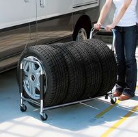 ●タイヤ4本の保管・移動が大型キャスター付きで楽々! ●タイヤカバーも付いています! ●タイヤを痛めないパイプガード付き。 ●タイヤ直径 約690mm、巾245mmまで対応。 |