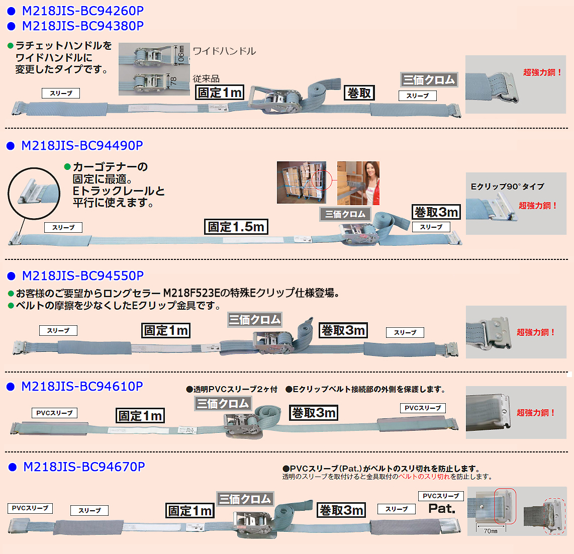 国内初となるJIS 表示のプロ用ベルト荷締機(2019年6月現在) | JIS認定ベルト荷締機(巾50mm)Eクリップ仕様 品番 M218JIS-BC93100P 価格は下記をご覧ください。 |