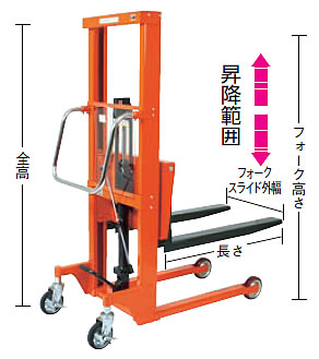 | ■特長 ●標準よりも100mmフォークを伸ばしました。 ●前車輪を大きく(φ150)し、凹凸ある路面でも操作しやすくしました。 ●狭い通路でも簡単操作、場所をとらない足踏み式のリフターです。 ●独創的な形状のメッキハンドルで自在なハンドリングです。 ●新構造のマストでガタつきを減少させスムーズな昇降を実現します。 ●荷物の重さによって上昇ピッチが自動的に切り替わる油圧式の早送り装置付です。 ●許容荷重の20%の荷重まで約3.5倍早く上がります。 ●過負荷防止バルブ付です。 ■注意 ●車上渡しのため、お客様での荷降ろしが必要です。 ●重量物ですのでご注意ください。 ●フォークを足にかぶせた時は最低高さが上がります。 ■用途 ●凹凸のある作業場での荷物の昇降や運搬 ■寸法図 ![]() ■仕様