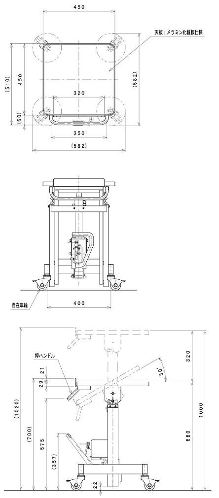 ■特長 ●チルト機能付(最大30度まで角度変更可能) ●天板は傷が付きにくいメラミン化粧板を使用。 ■用途 ●室内での軽作業に。 ●事務作業のサイドテーブルとして。 ●部品の加工、梱包、組み立て検査。 ![]() ■寸法図 ![]() ■仕様