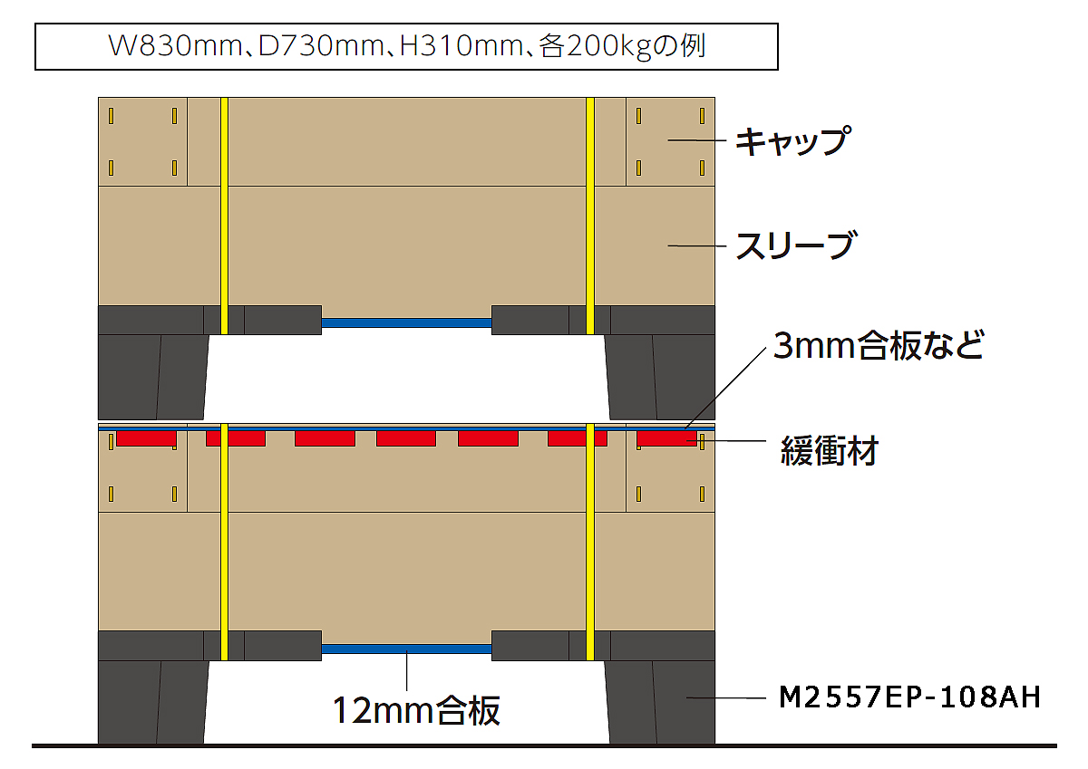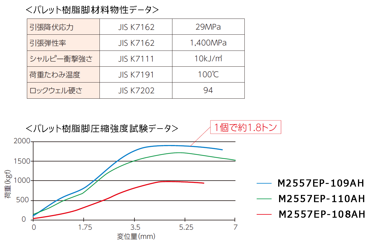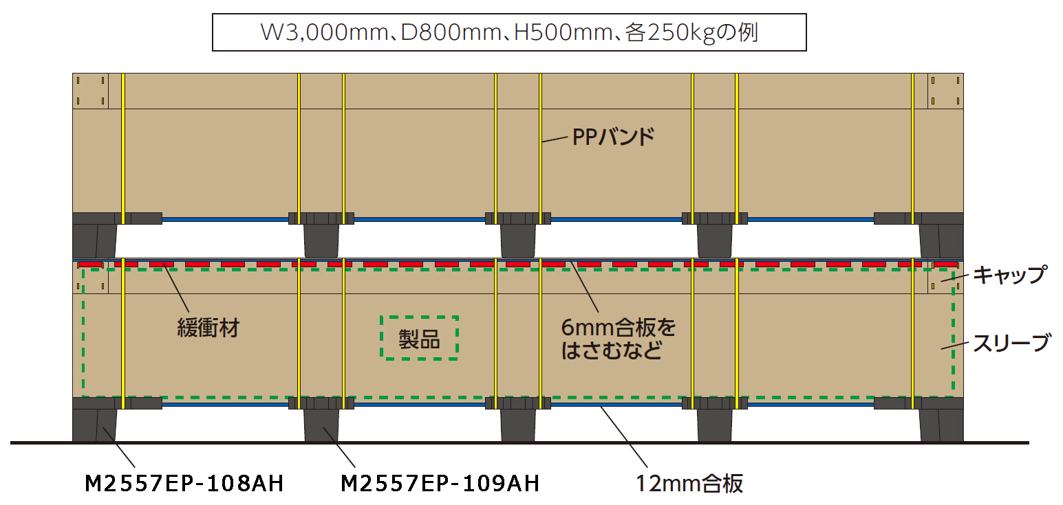 | ■特長 ●サイズ不問 当パレット脚は荷物の大きさに関係なく使用できるフリーサイズパレットです。様々な大きさの荷物の梱包に対応することができ、長尺貨物(2m以上)の梱包にもご利用いただけます。 ![]() ●ケタの高さは112mm、フォークリフトとハンドリフトに対応します。 ![]() ![]() ●JAS規格の(熱処理された)合板(12mmなど)に当パレット脚を取り付けて、スリーブとキャップを被せて梱包することも可能です。 ※中に入れる製品は、それぞれのM2557EP-109AHとM2557EP-108AHに対して、均等に荷重がかかるように配置して下さい。 製品とキャップの間には、緩衝材や合板をかませて、2段積みした際に下段ダンボールキャップ天面が凹まないよう対策下さい。 ![]() ![]() ●環境に配慮した輸出ワンウェイ用プラスチックパレットです。 ポリプロピレン製で、水分や化学物質の放散もなく、RoHSやREACH指令にも対応しています。 ●省スペース 当パレット脚はとてもコンパクトです。保管スペースは木製パレットの1/10です。 ●軽量・高強度 荷物を2段積みすることができます。2段積みで輸送する場合は、荷崩れしないよう正しい荷扱いをしてください。 ●製品強度と耐衝撃強度のアップ(メーカー従来品に対して) プラスチック製品の圧縮強度試験 :JIS K7181 / ISO604 / ASTM D695 ![]() ●重量貨物への対応 M2557EP-110AHとM2557EP-108AHを使用することで、約500kgの重量貨物への対応が可能となります。 その場合、強化ダンボールの選定、強度設計は梱包作業管理者の下行って下さい。(底面にベニヤ板を敷くなど。)M2557EP-110AHは、エステルバンドの2方向掛けを推奨しますが、スーパー布テープ等で固定することもできます。 ![]() <M2557EP-110AHの引き抜き強度(kgf)>