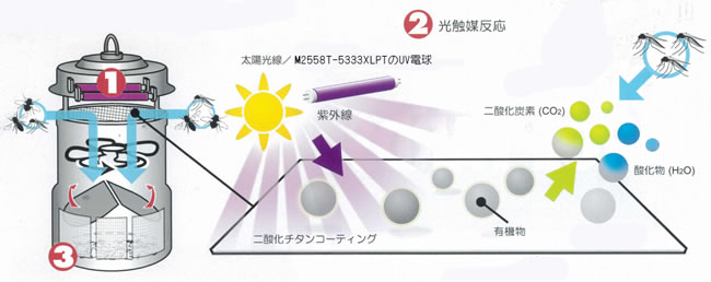 | ●全天候型 ●屋外専用モデル 全天候型で、雨ざ らしの場所でも問題なく使えます。 (IPX4相当の防水性能を保有しております。) ●殺虫剤/芳香剤は使用しません。 ●半径35mに及ぶ広域な有効範囲 ■M2558T-5333XLPTの技術は昆虫駆除のための3段階の手順を採用しています。 1.強力なUVライトがユニットに昆虫を引きつける光と熱を出力します。 2.内部での光触媒反応により蚊が好む二酸化炭素を生成します。 3.内部に誘引された昆虫を、強力なファンの風圧で脱水し死滅するまで閉じ込めます。 ![]() M2558T-5333XLPTはM1618T-2211Tの2倍のサイズです。 より明るい電球、大容量のかご、そして強力なファンを搭載しています。 ■特徴 ●屋外専用モデル 全天候型で、雨ざ らしの場所でも問題なく使えます。 (IPX4相当の防水性能を保有しております。) ●高価な誘引剤やプロパンガスは不要 ●無煙無香 ●昼夜を問わず使用可能 ●半径35メートルに及ぶ広域な有効範囲 ●特許取得の自動弁が昆虫の逃亡を防止 ●全天候型 ●簡単なセットアップと静動性 ●1年保証 ●付属品:UV電球2個-約3,000時間(4か月)、ブラシ、約3メートルの電源コード、AC100-120V ■使い方 ![]() ①紫外線 M2558T-5333XLPTの特別なUV電球は昼夜を問わず昆虫を引き付ける光と熱を生成します。 ②二酸化チタンコーティング TiO2(二酸化チタン)塗装を施した表面からCO2(二酸化炭素)が発生します。 これは、UVライトが二酸化チタンコーティングに当たることで起きる光触媒反応によるものです。 ③パワフルな吸引ファン M2558T-5333XLPTの強力なファンがかごに昆虫を吸引し、閉じ込めます。 昆虫は脱水により通常24時間以内に死に至ります。 かごは取り外し可能ですので、内容物をそのまま廃棄することができます。 また、自動弁により電源が切られた状態でも昆虫を閉じ込めることができます。 ■仕様