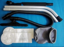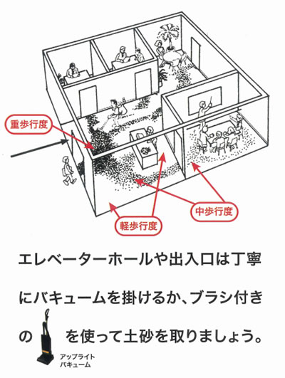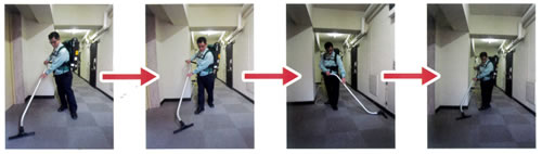 | ■特長 ●ノズルは前後ではなく、モップのように横から横に動かします。(アップライト型の約3倍の作業性) ●カーペットの汚れやゴミは下に入り込みますので、パス(人の通り道)を重点的にバキュームします。 ●腰をかがめないで、楽な姿勢で作業ができます。 ■ノズル(35cm幅) ![]() ●ノズルの先は、空気が入りやすい構造になっています。 ●空気が入ることでノズルが滑りやすくなり、吸引力を強くしています。 ■付属品 ![]() ●ホース、ノズル類以外に、クロスフィルターバッグ(布バッグ)1枚、ペーパーマイクロフィルターバッグ(紙バッグ)2枚が入っています。先に布バッグを入れてください。 ■プラグ ![]() ●電源によっては、右の2本足プラグが必要になります。 ■横から横へノズルをすべらせます ![]() ■タイルカーペット ![]() タイルカーペットは従来のカーペットと構造が全く異なります。 下地のゴムが厚く、毛足が短いのです。 この為、単に吸い込むだけのバキュームではノズルが吸い付いてしまい、汚れも取れません。 タイルカーペット用のノズルは脇から空気が入り、その空気の移動で汚れを取る様設計されています。 こうしたノズルの出現が横に滑らせる作業を可能にしたのです。 ■振り幅が違う! ![]() ■人の通り道(パス)を意識しましょう! ![]() ■仕様