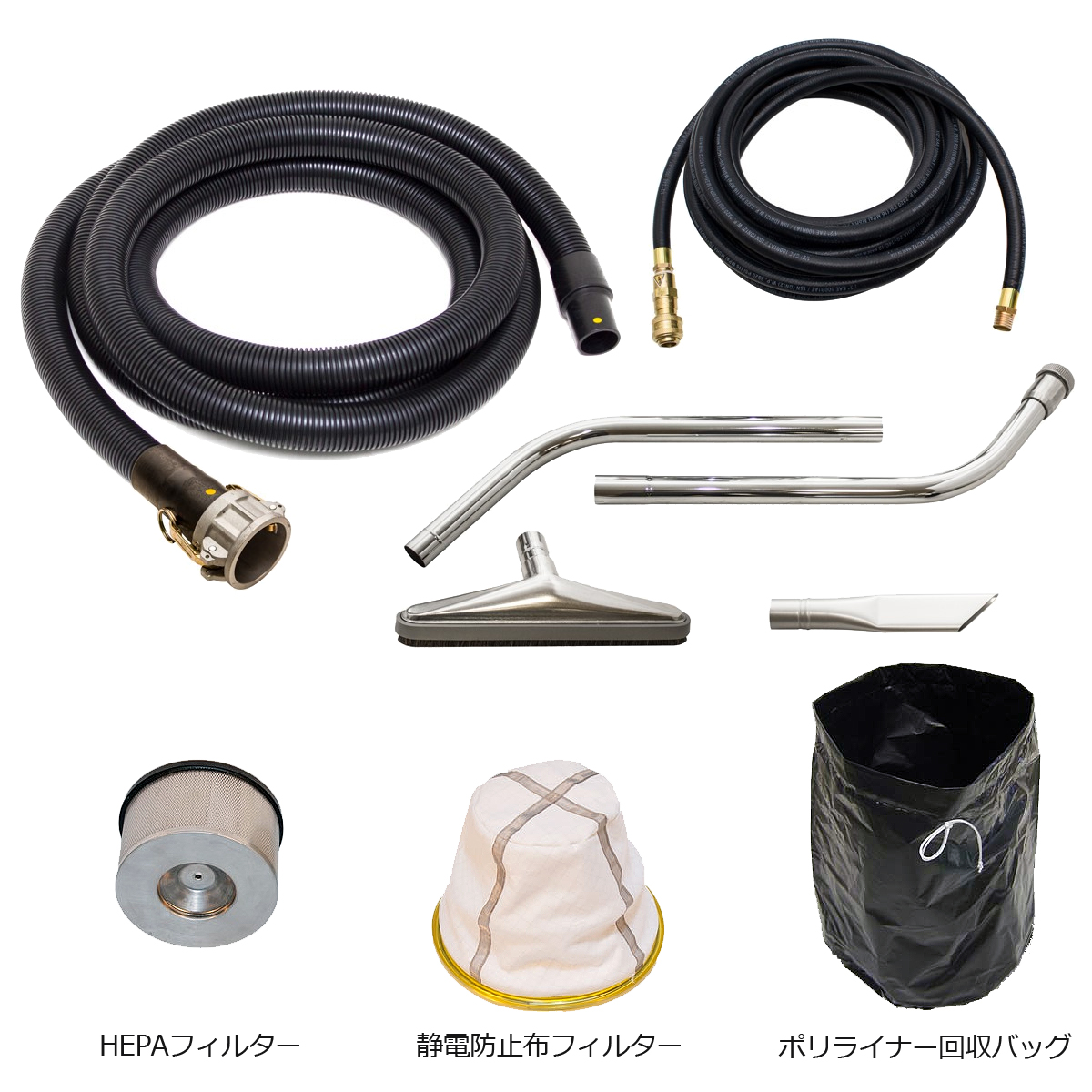 | ■特長 ●IEC規格認証の掃除機(保護等級 EX h IIC T6 Gb) ●HEPAフィルター:0.3ミクロンの粒子に対して99.995%の粒子捕集率 (検査済み:IEST RP-CCOO1.3.H14 by MPPS method as per EN 1822) ●ZONE21、22クラス(粉塵)の危険区域での回収用にデザイン ●エア駆動方式 ●手動フィルター浄化システム(MFS)内蔵 ●乾式回収専用 ●ステンレスSUS430構造(本体と回収タンク) ●回収物を安全で簡単に処理するための取外し式回収タンク ●移動に便利な静電気防止型4輪カートとバスケット ![]() ■付属品 ![]() ■仕様