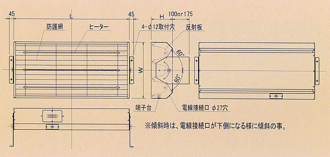 | ■特徴 ●赤外線照射域が限定的 赤外線を暖房域に限定的に照射する事により、暖房域に於いて最大限の暖房効果が得られる。 ●放射効率が高い 熱源ヒーターから放射される赤外線のほとんどを暖房域に向けて照射する。 ●ラニングコスト低減とCO2排出削減 限定的照射と高放射効率により暖房機総入力が小さくなり、部分暖房運転性も向上した。」 この結果、ランニングコスト低減とCO2排出削減が可能となった。 ●早い立ち上り スイッチON/OFFとほぼ同時にエネルギーの立ち上り、立ち下げを行う事が出来る。(3~5秒) ●柔らかな発光色 ハロゲンランプの様な眩しさがなく、炭火色に発光します。 ●適用場所 大空間でのゾーン暖房及びスポット暖房に適しています。 ●首振りが可能 ヒーターの照射方向を上下60°自由に首振り出来ます。 ![]() ■外形図 ![]() ■仕様表