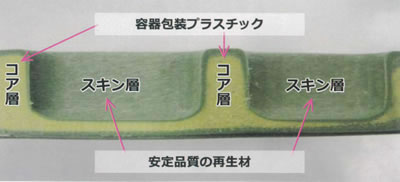 | ■MMPとは… Master Mold Plate(略称:MMP)技術は、再生プラスチックを用いた自動車バンパーを成形するために神戸製鐡所が開発した射出成形関連技術です。 MMPを用いることにより、コア層とスキン層の3層構造によるプラスチック成形(“サンドイッチ成形”)が可能になります。 コア層に家庭から排出される容器包装プラスチックなどを利用し、スキン層で挟み込むサンドイッチ成形技術を導入することにより、従来のヴァージン材100%パレットと同等の品質・強度を保つ事を可能と致しました。 ![]() ■サンドイッチ成形とは… 2系列の射出ノズルから時間差で異なる樹脂を注入し、コア層とスキン層の3層構造にします。 ![]() ■特長 ●強度と品質は従来のヴァージン材100%パレットと同程度 ●材料に再生(容器包装)プラスチックを使用するため低コスト ●資源の有効活用により、ナフサの使用量を削減 ●容器包装プラスチックの利用により、限りある最終処分場の延命化に貢献 ●スキン層に工場などの産業廃棄物系プラスチックを利用し、排出元に再度パレットとして利用を頂く事で、クローズドシステムの実現が可能 ■仕様