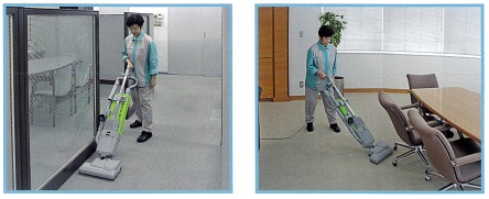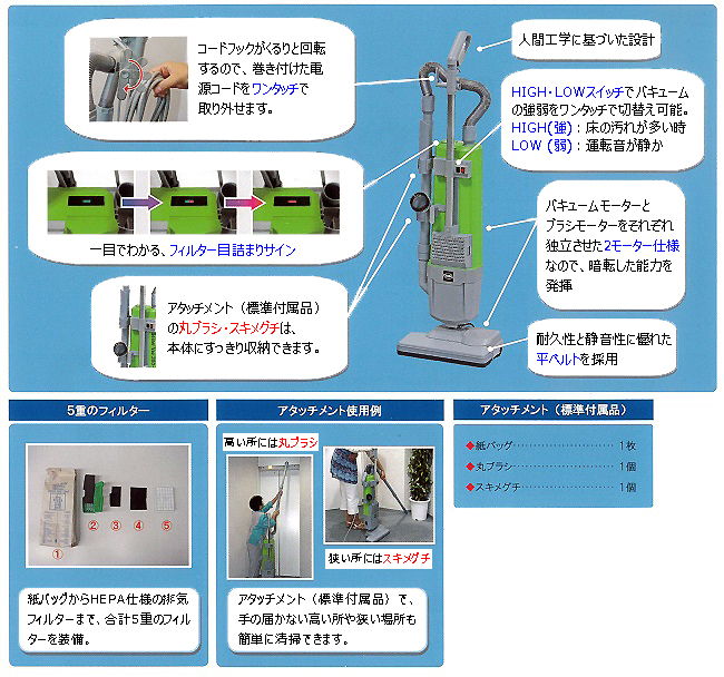 | ■特徴 ●電動式(100ボルト) ●プロ仕様 ショッピングセンター、ホテル、旅館、レストラン、オフィス、結婚式場、店舗、会館、劇場、クラブハウス等々、さまざまな場所の日常清掃の必需品! プロ仕様のカーペット清掃機です。 ●クリーンな排気 吸引した空気がバキュームモーターに至るまでの経路に3重のフィルター、バキュームモーターから排気されるまでの経路に2重のフィルターを設置。モーターを保護しつつ排気もクリーンに。機械にも環境にもやさしい設計です。 ●HEPAフィルターで微粉塵をキャッチ 合計5重のフィルターのうち、最終フィルターにはHEPAフィルターを採用。0.3ミクロンの微粉塵を99.97%捕集します。 ●ハイ・ロースイッチで強弱切り替えワンタッチ 事務所など作業中の運転音が制限される現場では、ハイ、ロースイッチでバキュームモーターの回転数を落とし、運転音を下げることができます。 ■使用例 ![]() ■各部機能 ![]() ■仕様