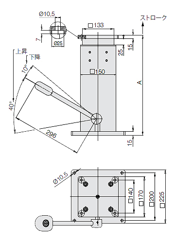 | 当商品は特に医療分野における医療用機器ならびに産業分野における組立治具、作業台、展示台などの昇降作業に最適です。 装置の昇降又は高さ調整用のベースユニットとして使用されます。 フットペダルを操作すると、リニアアクチュエータに組み込まれたピストンポンプからシリンダーに作動油が流れ、上面プレートが上昇します。 下降するときは、ワークの自重によりシリンダーから作動油が押し出されます。また当商品は、ワークの自重に関係なく一定の速度で下降します。 用途により、最大荷重が異なる3つのタイプから選択できます。またペダルの操作1回当りの上昇距離は、タイプごとに異なります。 ![]() ■特長 ●シンプル且つ直感的な操作 ●作業しやすい高さに調整 ●産業用の堅牢な構造 ●製造加工や組立作業における品質の向上 ●短期間で投資回収が可能 ●組立作業の処理能力と効率を向上 ●静的負荷に対する高い安全性 ■操作 上昇させるためには、フット・ペダルを約40°多数回踏み込みます。フットペダルは、スプリングにより元の位置に戻ります。 下降させるには、フット・ペダルを約10°上方に動かしてください。 ■取り付けと設置方法 他のモジュールやユーザーのワークを取り付けるため、上面プレートにはピッチ140×140の穴(M10用×4)があります。 また底面を他のモジュールに固定する為には、底面プレートにあるピッチ200×200の穴(M10用×4)を使用し、さらにこの底面プレートは当商品を床面に固定するときにも使用します。平らな床面に固定するときは、強度クラス10.9のボルト4本と相応の強度を持ったプラグで固定してください。 また、姿勢をより安定させる為に、底面プレートに取り付ける幅広のベースプレートがアクセサリーとして用意されています ■用途 効率的な組立工程を構築する為に役立ちます。 ●組立作業 ●作業台の高さ調整 ●保守点検 ●組み付け治具 ●搬送ラインの高さ調整 ●製品の梱包及び搬送作業 ![]() ■寸法図 ![]()