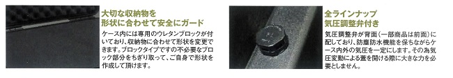 ■特長 ●砂塵の進入を防ぎ、水の進入を防ぐ気密性を兼ね備えた、強靭な安心のプロテクトケース。 ●運ぶ物を守ることを最優先に考えた軽量で持ち運びやすいケース。 ●専用ウレタンブロックで、精密な機械やデリケートな物を持ち運ぶのに適しています。 ●高性能カメラ・ドローン・楽器、測定機器等、大切な物をしっかり運びます。 ●IP67基準の防塵防水性能が急な雨風・万が一のアクシデントから、大切な物をお守りします。 ●気圧調整弁付き:防塵防水機能を保ちながらケース内外の気圧を一定にします。その為気圧変動による蓋を開ける際に大きな力を必要としません。 ■その他特長&寸法 ![]() ![]() ■仕様