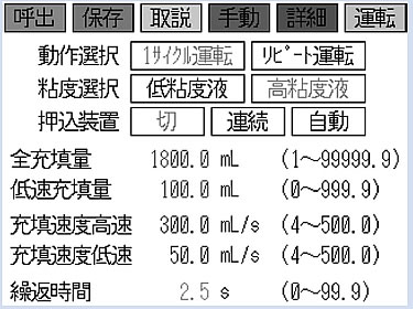 | ■特長 ●操作部にタッチパネルを採用し、操作が簡単です。 ●駆動部はサーボモーターを使用しております。 ●手動、連動、寸動、リピート運転などあらゆる運転サイクルを選択可能です。 ●構造が簡単で工具無しで分解・洗浄・組立が可能です。 ●充填データは最大10件まで保存・呼出が可能です。 ●ホッパーやノズルは様々な形状、大きさがあり選択可能です。 ●スペースがコンパクトで様々な場所で充填可能です。 ■使用例 接着用のり、ケチャップ、焼き肉用・ギョーザ用タレ、ようかん、チョコレートシロップ カレールウ、ミートソース、ビーフシチュー、マーボー豆腐の素、アイスクリーム、チーズケーキ生地 のり佃煮、ジャム、シャンプー・リンス、ニンニクのすりおろし、食用油、その他 ■操作パネル ![]() ■寸法図 ![]() ![]() ■概略寸法表