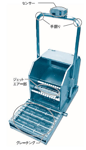 | ■特長 ●ジェットエアーでピピピッと乾燥 ●一般シューズはもちろん溝の深い長靴や安全靴までも。 ●靴底の水滴を数秒で除去 ■こんな時に ●濡れた靴底で通路や階段は危険 ●洗った靴底を乾かしたい ●ウエットフロアーからドライフロアーへの境に ●雑巾で靴を拭くのは不衛生 ■衛生管理者様へのおすすめ 設置は簡単、設置場所に置き、電源(100V)を接続するだけです。(配水管接続も可能) 靴底が濡れたままだと、水滴と共に汚れを持ち越し下駄箱が腐ったり、汚れが再付着する恐れがあります。 外装がSUS製なので、清掃し易く衛生的です。 ■部分名称 ![]() ■使用方法 ①グレーチング部の上に載って下さい。 ②センサーが感知してジェットエアー部から高圧空気が出ますので、靴底の裏の水分を取り除いて下さい。 ③グレーチング部の上から降りて頂くと自動的に停止します。 ![]() ■寸法図 (単位:mm) ![]() ![]() ■仕様