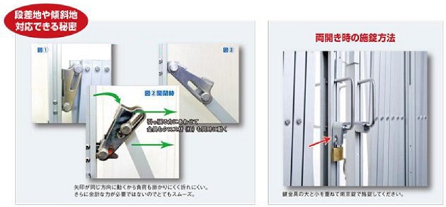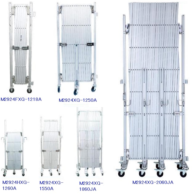 | ■特徴 本シリーズは、軽量・耐久性・操作性・美観を徹底追求した為にオールアルミ合金製(アルマイト加工)としました。ボルトナット類には錆びに強いステンレス、クロス材を留めるワッシャーとスリーブ材にはナイロンを使用し、開閉がスムーズでサビにくくしてあります。オプションでキャスター台座は、一輪と二輪・固定と自在 にそれぞれを組み換えることが可能となっております。ご家庭用の門扉にもご使用いただけます。 ![]() ![]() ■タイプ