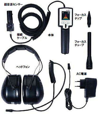 | ■特長 ● 省エネ・CO2削減に貢献(ESCO対応機) ※ESCO(Energy Service Company)とは・・・ 工場や事務所、オフィスビルや商業施設公的施設などに対して、エネルギー効率の改善策を提案、コスト削減効果を保証し、削減したエネルギーコストから報酬を得る事業。 ●ガスが配管からリークする際に、配管との摩擦で40kHz帯の超音波が発生します。 「M2949S-530I」は、同周波数帯の超音波を検知し、非接触でエアリークを発見することが可能です。 また、40kHz帯のみ検出を行いますので、工場稼動中機器の騒音がある環境でも効率的にリークを発見することができます。 (エアパージや機器から排気のある場所を除く) ●「M2949S-530I」は、コンパクトな本体設計が特徴ですが、センサー部を取り外して検知が可能です。以下の環境でのリーク検知に便利です。 ・入り組んだ配管のチェック ・装置内(BOX内)のリークチェック ・スチームトラップのチェック など 付属のヘッドホンを着用して音の変化でリーク箇所を特定することが可能です。 (下記写真参照) ![]() ●オプションの超音波トーンジェネレーターを利用した簡易密閉度検査(シール検査)にもご利用いただけます。水没試験よりも手軽にシール検査が可能です。 ※検出可能なリークサイズは、環境・形状により異なります。 ![]() ■セット内容 アタッシュケースに収納ができます。 充電電池で使用できるコードレスでどこでも使用でき邪魔になりません。充電は付属の専用ACアダプターでできます。