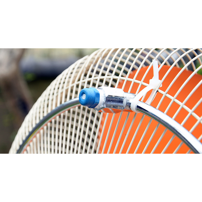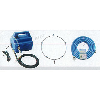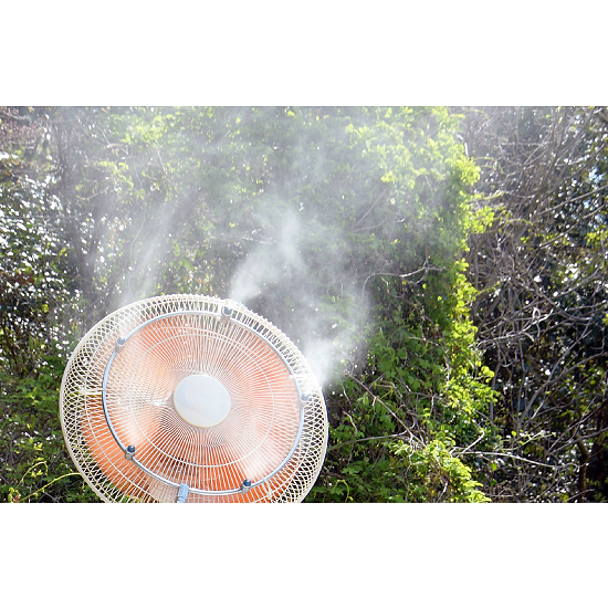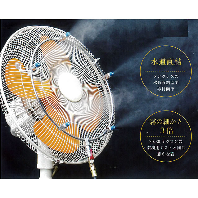 ご家庭や職場でも商業施設で見る細かな霧を体感できます。 組立は、ホースとミニブーストポンプをワンタッチ接続し、ミストリングを扇風機に取り付けるだけ。 細かな霧による地表温度の低下と扇風機による空気の循環により一層の涼しさを体感できます。 |
