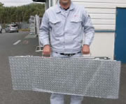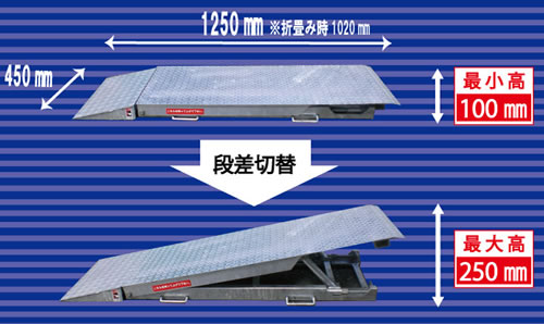 | ■特長 ●運搬時に持ちやすい取っ手付き ![]() ●段差調整は有効幅内では自由自在 ![]() ●折畳み可能で持運びが便利 ![]() ●スチール材で45kg(自重)の軽量設計 ●さびに強く・誰にでも使いやすいシンプル安心設計 ■製品画像 ![]() |