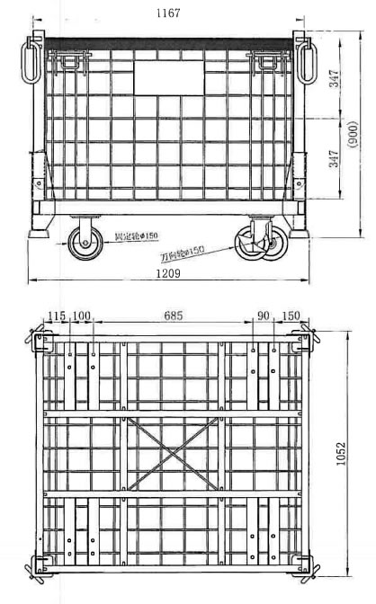※注意 1)吊り上げの際は、4点吊りを厳守してください。 2)ゲートを開いた状態での吊り上げは禁止です。 3)吊り輪以外の箇所での吊り上げは禁止です。 ■寸法図 ●キャスター付吊りボックスパレット/品番 M2985-CTPJ ![]() ![]() ●吊りボックスパレット(キャスター無)/品番 M2985-CTPJ ![]() ![]() |