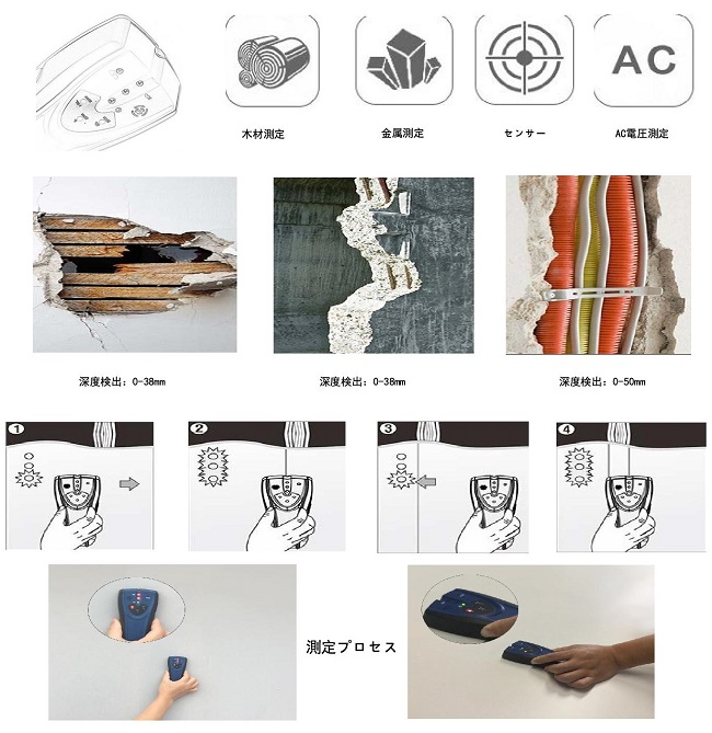 電気信号を使用して、乾式壁または他の一般的な建築材料を通してスタッド、金属または活線のAC電圧ケーブル端を探します。 |