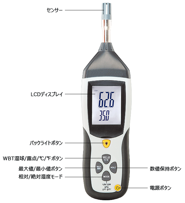 ハンディデジタル温湿度計 温度、湿度、露点、湿球、相対湿度、混合比 |