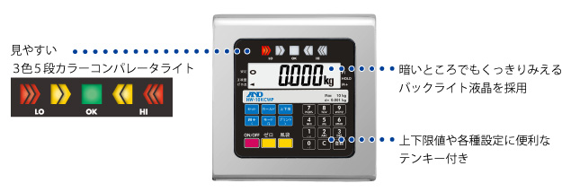 3色5段コンパレータライト+テンキー付き 防塵・防水等級IP65 シングルレンジ1/10,000の高分解能 応答速度約1.5秒 |