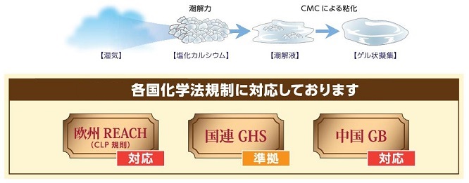 | 塩化カルシウムが持つ強力な吸湿特性を最大限に活用して開発された商品です。 水分を凝集・粘化させる天然素材の高性能水溶性高分子を利用しております。 CLP規則に基づく表示対応しております。 *CLP規則とは、分類(Classification)、表示(Labelling)、包装(Packaging)に関する法則で、世界調和システム (GHS) を導入する形で制定されております。 ![]() ■特徴 ●ハイパワー、即効性 本製品はシリカゲル等の無機系吸着乾燥剤に比べ、5~7倍の吸湿力があり、さらに初期吸湿能力に優れております。 起ち上がりは優秀で更にそのパワーの持続も他の追随を許しません。 ![]() 1)吸湿率は30C・90%RHの恒温恒湿槽で504時間(21日間)の吸湿量から算出しております。 2)試験サンプルにつきまして、本製品とシリカゲルの包材は不織布ベース、その他の包材は耐水紙ベースの乾燥剤です。耐水紙は湿気をよく通しますが、不織布よりも湿強度が足らず、液漏れや破れが起こりやすくなります。 ●タイプ