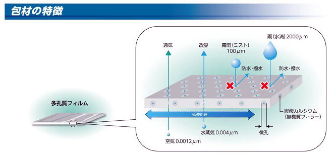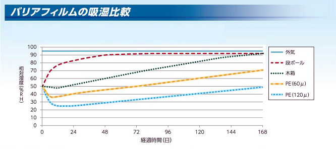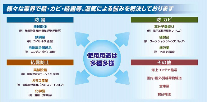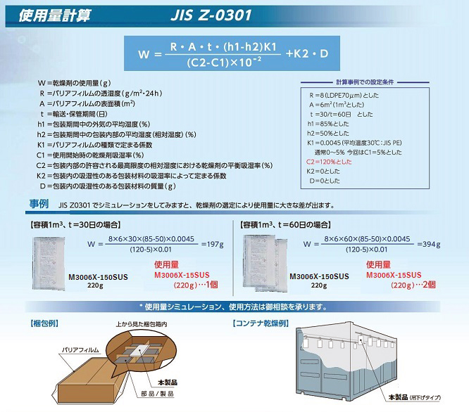 ●安全性 吸湿時に化学反応を起こしません。高純度無水塩化カルシウムが湿気を吸湿し、高分子CMCが潮解液をゲル状に凝集します。この2物質は融雪剤や食品添加物に指定されているほど安全です。 ご使用後は産業廃棄物、一般廃棄物として処理が可能です。 ●本製品は各国化学法規制に対応しております。 特に欧州、中国での化学物質等の法規制についてはいち早く対応を済ませ、安心して輸出・使用していただけるよう対応しております。 対象製品1つごとに下記法規制すべてに対応したラベル表記を施しております。 ![]() ●ダンボールや木箱は湿気をよく通します。乾燥剤をご使用の際は、PE等の透湿度の低いバリアフィルムの使用が重要です。 ![]() ●メーカー独自に研究を積み重ね開発をした包材が使用されております。この包材は水蒸気はよく通しますが雨や水滴は通しません。 ![]() ■使用・用途例 ![]() ■仕様 ●両面吸湿ができるシリーズ ![]()