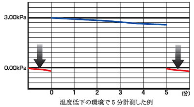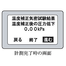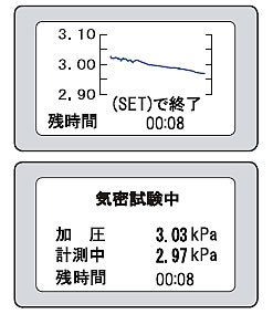 | ■あらゆる測定シーンで活躍可能な6つのモード ●気密試験 配管工事等の完成検査用の試験で、ポンプで加圧した空気圧(2~10kPa)を使用します。 ●温度補正気密試験 温度影響を受ける場合に自動的に補正を行う気密試験です。 ●漏洩検査 ガスの供給開始時、供給設備・消費設備点検用の検査で、1kPa以上のガス圧を利用します。 ●温度補正漏洩検査 温度影響を受ける場合に自動的に補正を行う漏洩検査です。 ●ロガー計測 最大24時間の圧力値を時間経過毎に逐次計測し、登録・印字します。 ●現在の圧力 瞬間圧力値を計測します。登録・印字は1ポイントのみ。 ■特長 ●計測がスピーディになりました。 前回の設定条件ですぐに計測が始められます。 ![]() ●計測中の圧力変化を確認できます。 ![]() ●微少な圧力変化を捉えデジタル・グラフ表示します。 ![]() ●登録データはいつでも印字できます。 M31LT-SPT2Eはプリンターを内蔵。 計測した結果はその場で印字できます。また、計測結果を登録しておけば何度でも印字が可能です。 ![]() ![]() ●パソコンにデータを転送して計測結果を管理できます。 パソコンに転送したデータは、エクセル形式のデータ管理ソフトで、閲覧・保存等が行えます。 ![]() ●合計400件まで計測・登録できます。 気密試験・温度補正気密試験・漏洩検査・温度補正漏洩検査・ロガー計測・現在の圧力共に合計400件の計測・登録が可能です。各計測の混在も可能です。 ●容量50リットルまでは、温度補正モードで計測できます。 配管の測定圧力は周囲温度に影響されるため気密試験・漏洩検査の結果、判断に迷います。
