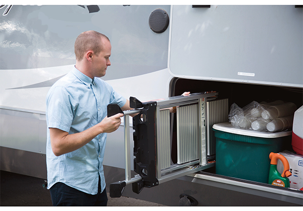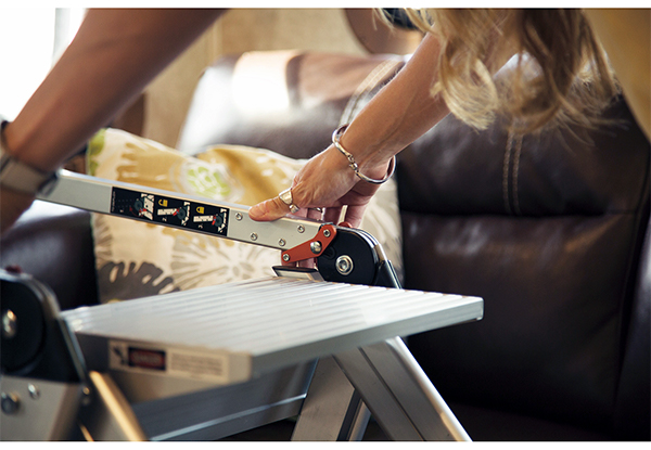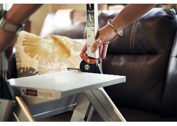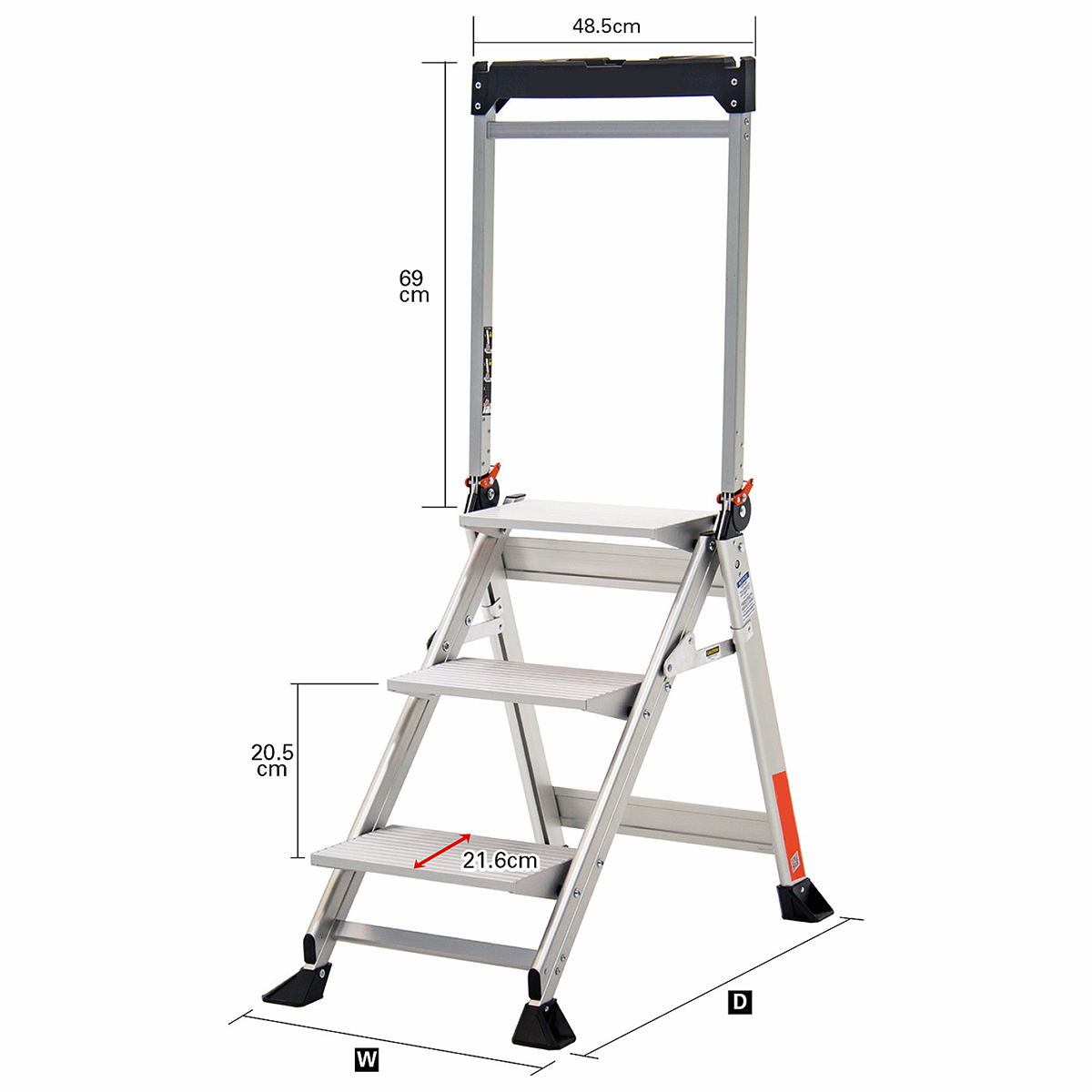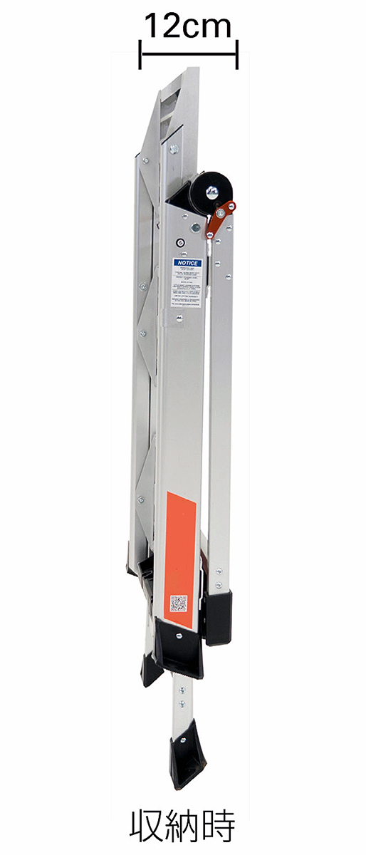 ●緩やかな昇降角度と幅広ステップで安心して昇り降りができます。 ●上枠が付いているので天板の上でも安心して作業ができます。 ●背面キャスターが付いており、折りたたまなくても、上枠を持って、カートを引くように移動ができます。 |