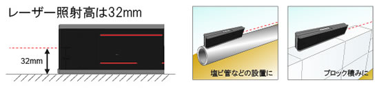 | ■特長 ●回転する液晶表示(バックライト付) 液晶表示部が単独回転するため、本機をのぞき込むことなく数値を読み取ることが出来ます。 ![]() ●レーザーポイント照射可能 レンガやブロック積み、U字溝の設置や塩ビ管などの設置に高さ合わせや水平出しに便利です。 ![]() ●整準プレート使用可能 オプションの整準プレートを使用すれば水平面でなくてもレーザーを水平に照射可能 ![]() ●ゼロセット可能 任意の角度をゼロセットできます。 (比較表示モード) ●マグネットV字溝 測定面はV字カット、パイプの上でも安定します。(マグネット付) ●防塵・防水IP54相当 IP54相当で現場でも安心して使用可能です。 ■寸法図 ![]() ■仕様