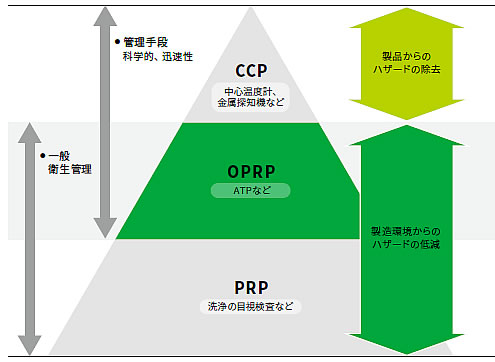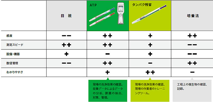 | ■「食の安全」を担保する上で、製造工程における環境検査はたいへん重要です。 食品事故の多くは、製造工程での微生物、異物、アレルゲンの混入によるものです。 通常抜き取り検査で行われる原料検査や製品検査だけでは十分な管理ができているとはいえません。 日本国内で制度化が推進されているHACCPにおいても一般衛生管理の重要性、特に科学的な根拠に基づくOPRPの充実が求められています。(下記参照) 「M559LM-1S」は、工程の洗浄が正しく行われているかを現場で確認でき、迅速に適切な対策をうつことにお役立ていただける製品です。 目的や用途によって、使い分けしていただけるように、ATP、タンパクなどの指標を用いた製品ラインナップをとりそろえております。 ![]() ■目的にあわせた活用が可能です。 下記の表示はタンパク残留測定スワブM559RO-50Sを前提としたものです。 表の+、ーの表示はイメージであり、絶対値ではありません。 ![]() ■特長 ●操作性に優れたタッチパネル&見やすいカラーディスプレイ。 ●コンパクトで壊れにくい堅牢設計なので持ち歩いても安心。 ●その場で即検査し、すぐに精度の高いデータが得られます。 ●専用ソフトウェアを使って結果の分析ができます。 ●115mmの長いスワブはふき取り量のバラつきを抑え、届きにくい部分も簡単にふき取れます。 ●M559XL-100Sはあらかじめスワブが湿っていますので、汚れを容易に回収できます。 ●M559QT-200Sは水中のATP 測定ができます。 ![]() ■使用方法 まず、ソフトウェアをパソコンにインストールします。 次に、使用前に測定ポイントを決め、ソフトウェア上に設定してください。 測定機をパソコンに接続して、ディスプレイに表示されたポイントに従って、測定 ①②③を開始します。 測定後、測定機をパソコンに接続すると、データが更新され、ソフトウェアを用いた様々な分析が行えます。 ![]() ■専用のソフトウェアによる解析 ![]() ![]() ■仕様