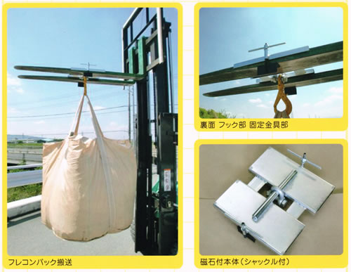 フォークリフト用フック付吊り冶具 フォークリフトを使っての玉掛けワイヤー吊作業やフレコンバック等の紐掛け作業時に使用。 フックに掛けて安心! フック自体は磁石付本体に吊るされ、ホークの任意の位置に脱着簡単。 本体磁石はゴムで保護固定されて、吊り荷物のクッションになり滑り止めにもなっている(安全の為に金属製固定部付き) |