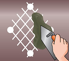 ■計量 主剤・硬化剤を配合比に従い計量。 できるだけ秤を使い、重量比で行ってください。 ![]() ■混合 ●パテ状 平らな板の上に取り出し、パテナイフ、ヘラなどで混合する。 ●液状 プラスチックの容器に入れ、パテナイフなどで混合する。 ![]() ■エクスパンドメタル エクスパンドメタルを点溶接で仮止めし、上から補修剤を塗布 ![]()