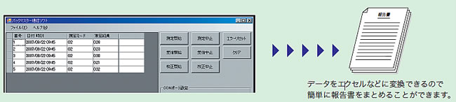 <ガス採集硝子管:M675S-2E> 水中で容器を開封し、ヘッドスペースのサンプルガス全てを採集して内部のガスを抜き取り、ハウジング内へ送り込みます。 ※ガラス製品につき多少のサイズ誤差がありますが、あらかじめご了承ください。 ※硝子管内と大気との圧力差があるため、「加・減圧用サンプラー」(オプション)が必要です。 ![]() ![]() <プリンター:M675BM-910240> 接続するだけで測定ボタンを押せば自動でプリントアウトします。 印字例: ![]() <通信ソフト:M675O-PG> 報告書作成に時間がかかってしまう、という方におすすめ。 専用の通信ソフトを使うことで、データを自動で記録することができます。 報告書などの資料として活用したり、データの保管や管理、必要なデータの検索などが簡単にできます。 ![]() 本体にパソコンを接続し※1、測定ボタンを押すと自動でデータを転送します。 ※1. 接続にはシリアル端子(RS-232C)が必要です。 パソコン側にRS-232C端子がない場合、USB - RS-232C変換器をご用意ください。
