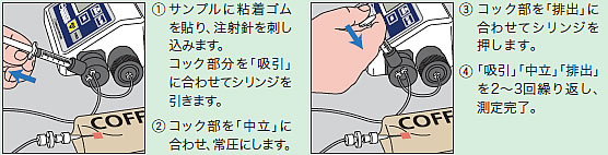 | ■特長 ●ワンタッチ測定 吸引ポンプ内蔵のため、測定ボタンを押すだけでOK。 ●液体を吸っても大丈夫 万が一液体を吸ってしまっても壊れることなく、簡単な部品交換やメンテナンスで対応できます。 ●電源ONですぐに使えます 暖機運転が不要なのですぐに測定できます。 ●操作が簡単 使用するボタンは5つ、分かりやすい操作になっています。 ●どこでも測定可能 乾電池でも使用できるので電源がとれない場所でも使用できます。 ■測定方法 ![]() ![]() ■作業時間短縮・安心を実感してください。 ●自動吸引だから測定ボタンを押すだけで測定できます。 ●自動安定機能により、安定したところで数値をホールドするので値を読み取るため につきっきりになることはなく、一人で2台使うことも可能です。 ■安心して取り扱うことができ、さらに可燃性ガスに強いガルバニ式酸素センサー(M675A-SGFE) ●寿命要因の40%を占めていた隔膜のキズやシワを、ハードカバーと1mm引っ込めた隔膜保護構造で徹底的に排除しました。取り扱い時に、気を遣わず安心してご使用いただけます。 ●酸素センサー内部の電解液の成分を調整し、析出物の発生を遅らせることで寿命がアップしました。 さらに電解液の変更と合わせて電極部の台座をセラミックにすることで応答速度もアップしました。 ●ガルバニ電池式のため、サンプルにアルコールやコーヒー豆等から排出される可燃性ガスや脱酸素剤から出る可燃性の副 生成ガスが含まれていても測定することができます。 (ジルコニア式の場合、指示値が低めに出ることがあります。) ■酸素センサーの交換(ワンタッチ交換) ![]() ■ムダなサンプルを最小限にしました 測定に必要なサンプル量は最小で3cc。 ガス量の少ないスティックパックも1サンプルで測定可能です。 ※複数サンプルを連続的に測定した場合で、かつ本体のポンプ流量を最小値に設定して測定した場合の、最小ガス量となります。 ◆例えばかつおぶしパックを1日100袋測定したら