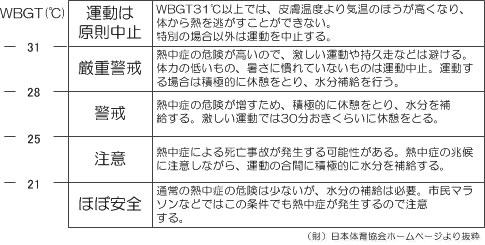 ■熱中症予防対策に活用していただけます。 公益財団法人 日本スポーツ協会は、熱中症予防のための指標には、WBGT (Wet-Bulb Globe Temperature) が有用であるとして、スポーツ環境温度をWBGTの値で管理することを推奨し、普及を図っています。 M69BGT-203AKは、アラーム機能を搭載し手軽にWBGTが測定できる汎用モデルです。 M69BGT-203BKは、アラーム機能に加え、測定データメモリ機能、通信機能を搭載した多機能モデルとなっています。 * 「スポーツ活動中の熱中症予防ガイドブック」:公益財団法人 日本スポーツ協会 ●熱中症予防のための運動指針 ![]() |