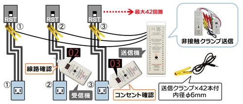 | ■特長 ●LAN・同軸・制御・電力ケーブルを被覆上から簡単に識別 ●安心・安全・簡単操作 非接触送受信で被覆上から探索、作業時間を大幅に短縮 ●分配器にクランプするだけで端末識別ができます。 ●ブレーカーはそのままで作業OK 0V無電圧線から300Vの活線まで全ケーブルに対応! ■用途 ![]() ■仕様