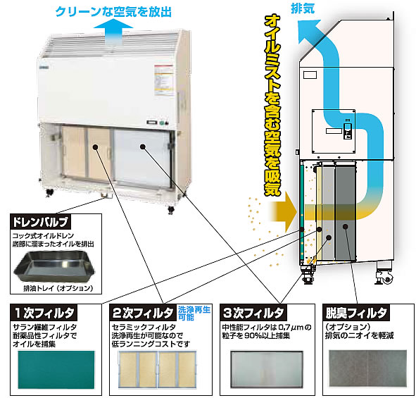 | ■概要 今までになかった床置きタイプです。 工作機械から出るオイルミストをダクトで吸引する従来のタイプとは異なり、空気清浄機のように常時運転して、工場内に浮遊しているオイルミストを捕集します。 オイルミスト吸引による健康被害の抑止、床が滑ることによる転倒事故など2次災害の抑止、設備機器(電子機器、精密機器)などへのダメージの軽減などのお役に立ちます。 ■特長 ●3層フィルタ構造で、オイルミストを確実に回収します ●メインフィルタ(セラミック式)は洗浄再生可能で、低ランニングコストを実現しました。またフィルタ洗浄(有償)も承ります ●高風量仕様(約50m3/min)で高い処理能力です ●フィルタ交換は工具レスで簡単です。またオプションで脱臭フィルタの装着も可能です。 ■用途 マシニングセンターなど工作機械が置かれた工場への設置 ■構造 ![]() ■外形図 ![]() ■仕様