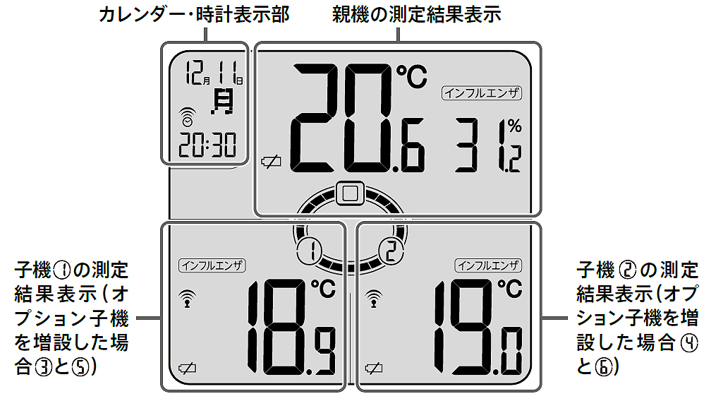 ■三ヶ所無線温度湿度計親機 外観![]() ■例えばこんな使い方 ・赤ちゃん、高齢者、ペットのいる部屋に子機を設置。 ・夜でも暑くなる寝室に子機を設置。 ・脱衣所や浴室に子機を設置して、ヒートショックを予防。 ・玄関の外に子機を設置して、室内と外気の温度差をチェック。 ・冬に寒くなるトイレに子機を設置。 ・花や植物を育てている場所や、家のまわりにあるビニールハウスに子機を設置。※通信距離 約50m(見通しの良い空間距離) ■特長 ●温度のバリアフリーがイラストで分かる 温度差が5℃以内の時には、画面中央にある輪がつながって表示されます。 ![]() ●簡易熱中症注意レベルなども確認 子機を設置した子供部屋などの、簡易熱中症注意レベル・インフルエンザ注意レベルが、本体(親機)を設置したリビングから確認できます。 ●子機は追加できます 子機は4台追加して合計6台まで使用できますので、本体も含めて最大7箇所の温度・湿度が分かります。 ■表示画面 ![]() ■仕様