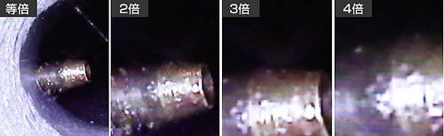 | ■特長 ●圧倒的に優れたジョイスティック操作 カメラを思い通りに自然な感覚で操れます。 ジョイスティック操作がしづらい先端可動式の内視鏡は思い通りに動かすことができないストレスから、業務に支障をきたす可能性があります。 この先端可動式工業用内視鏡に搭載されたジョイスティックは、指を軽くあてるだけで、俊敏に可動。自然な感覚で操作できます。 見たい場所へカメラを瞬時に向けられ、作業の高速化・効率アップに繋げます。 ●先端可動範囲 水平方向360°で一度に広範囲を確認 水平方向360度、垂直方向最大180度以上の先端可動で、隅々までカメラが映像をとらえ、傷や欠陥を見逃しません。 配管内部の真横を確認する際に便利です。 ![]() ●先端形状維持 指を離せば自動ロック。手の疲れから解放されます。 この先端可動式工業用内視鏡のジョイスティックは自動でロックがかかるため、指を離しても先端カメラはそのままの状態をキープします。 ジョイスティックを押さえ続けて指が疲れるということがありません。 ![]() ■45万画素の高画質映像 鮮明な画質・デジタルズーム 高画質・ズーム機能で欠陥などを見逃しません。 工業用内視鏡の機能で最も重要視したいのは、画質ではないでしょうか。画質が粗い製品では欠陥を見落としてしまうことも。 この先端可動式工業用内視鏡は、他の一般的な内視鏡と比べ高画質、45万画素で映し出します。小さな傷も鮮明に映し出します。 また、リアルタイム映像ならデジタルズームで最大約4倍まで拡大可能。さらに詳しく確認することができます。 ![]() ■比較画像(エンジン部品) ![]() ■ズーム映像(エンジン部品) ※デジタルズーム機能はリアルタイムのみ表示可能です。 この画像はモニタを撮影した画像です。 ![]() ■TV接続可能 複数人で同時に確認、共有スピードが向上します。 大きな画面で確認したい場合や、大勢で映像を見たい場合に便利なビデオケーブル付属。 TVの大画面なら点検の正確性向上や、複数人同時確認で判断スピードが速くなり、効率良く点検を進められます。 ■内部側面点検に最適 先端カメラ 湾曲時の長さが短い為、狭い内部の観察が出来ます。 この先端可動式工業用内視鏡は先端径が2.8mmと細く、狭い配管内の点検が可能です。 しかし、配管内の側面を観察する際に重要なのは、先端部を曲げたときの長さと焦点距離を合わせた幅が観察対象のサイズに適しているかというところです。 この内視鏡は曲げた時の長さが一般的な内視鏡と比べ短いので、細くて狭い内部側面の観察に適しています。 ![]() ■調光可能LED 最適な明るさで点検、暗い場所の映像をはっきり映す 内視鏡で点検をする際、一番重要なのは検査対象の欠陥を見逃さないこと。 この先端可動式工業用内視鏡はLEDライトを調光できる機能を搭載。 最適な明るさでの点検が可能です。傷や不良の危険な見逃しを防ぎます。 ![]() ■ケーブル素材 丈夫で安心して使える高密度タングステン 内部状況がわかない場所で使用することが多い内視鏡は、汚れや障害物などでケーブルを傷めてしまう可能性があります。 この先端可動式工業用内視鏡のケーブルは耐摩耗性、堅牢性を兼ね備えた「タングステン」を採用。使用頻度が高くても丈夫なので安心して長く使用できます。 ![]() ■防水IP67、耐油性能 防塵・防水・耐油性能 水回り・油分のある場所でも不安なく使用できます。 一般的な工業用内視鏡は、排水管などの水気のある場所や、ほこりの多い場所で使用できる「防水防塵性能」を兼ね備えている製品が多くあります。 この先端可動式工業用内視鏡は、防塵・防水のみではなく、さらに、耐油性能をプラス。マシン油、軽油、灯油、エンジンオイルに対応しているので油分が付着する恐れのあるエンジン部品でも安心して検査を行えます。 ![]() ![]() ![]() ■この先端可動式工業用内視鏡の防塵防水性能、IP67は粉塵が内部に侵入することなく水深1mの水中に30分浸けても機器内部に水が浸水する事がない性能の証です。 ![]() ■観察後の再確認に便利 静止画・動画撮影 ボタン1つでデータ保存。報告・資料作成に役立ちます。 リアルタイム映像を残したいと思ったことはありませんか? 再確認ができれば映像の見落としを防ぐことができます。 この先端可動式工業用内視鏡はボタン1つで映像を静止画・動画撮影し、SDカードに保存。 検査後、報告などで画像を用いると信頼性が増し、状況をより具体的に伝えられます。 データをPCに移せば、報告書などの資料作成に役立ちます。 ![]() ■片手で持ちやすく疲れない 他製品に比べ重すぎない 持ちやすく、縦長で無駄のないデザイン 今までの内視鏡は本体上部のモニタが大きく、重く持ちにくい製品が多くありました。 そのような内視鏡は手がすぐに疲れてしまい、長時間の観察には不向きです。 この先端可動式工業用内視鏡は縦にすっきりとしたデザイン。片手で持ちやすいのが特長です。 重量約807g(ケーブル部1mの場合)