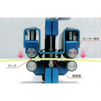 上下の押えローラーにより測定物をしっかりホールドするのでワークの傾きや測定者による数値のバラツキを抑え安定した測定が可能です。