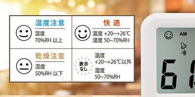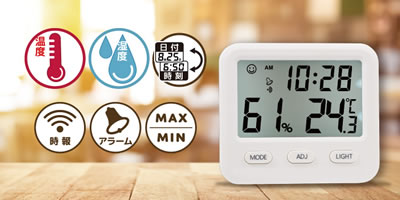 薄暗い室内でも見やすいバックライト機能付きモデル ・内部センサーで温度・湿度を測定、快適マークとともに表示します。 ・日付と時刻を切り替え表示。スヌーズ機能付き目覚まし機能つき。 ・壁掛け、スタンド、マグネット貼り付けの3通りで設置できます。 |
