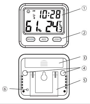 | ■特長 ●薄暗い室内でも見やすいバックライト機能付きモデル ![]() 温度・湿度のほか、日付・時刻(切り替え表示方式)、 時報およびアラーム機能つき。 ●快適表示マークつき ![]() 温度と湿度の状態から、4レベルで快適度合いを表示します。 ●置き方3通り ![]() 壁掛け設置、マグネットでの貼り付け設置、卓上スタンド ■各部名称