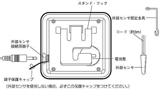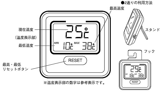 | ■特長 現在温度の表示 本器は本体内蔵センサと外部センサの2タイプを切り替えて使用できます。 外部センサを接続しない場合は、本体の周辺温度の値を表示します。 外部センサを本体に接続した場合は、自動的に外部温度センサの測定値表示に切り替わります。 最高・最低温度の表示 最高・最低温度を常時表示します。 最高温度(MAX)、最低温度(MIN)の記憶は下記の操作により開始します。 ・電池をセット、または取り替えた場合 ・リセットボタンを押した場合 ■各部名称 ![]() ![]() ■仕様