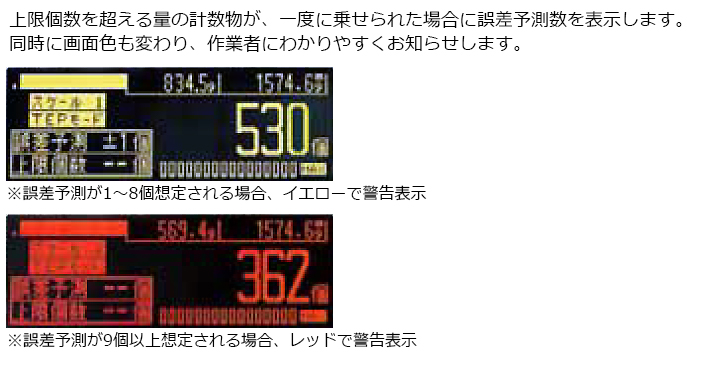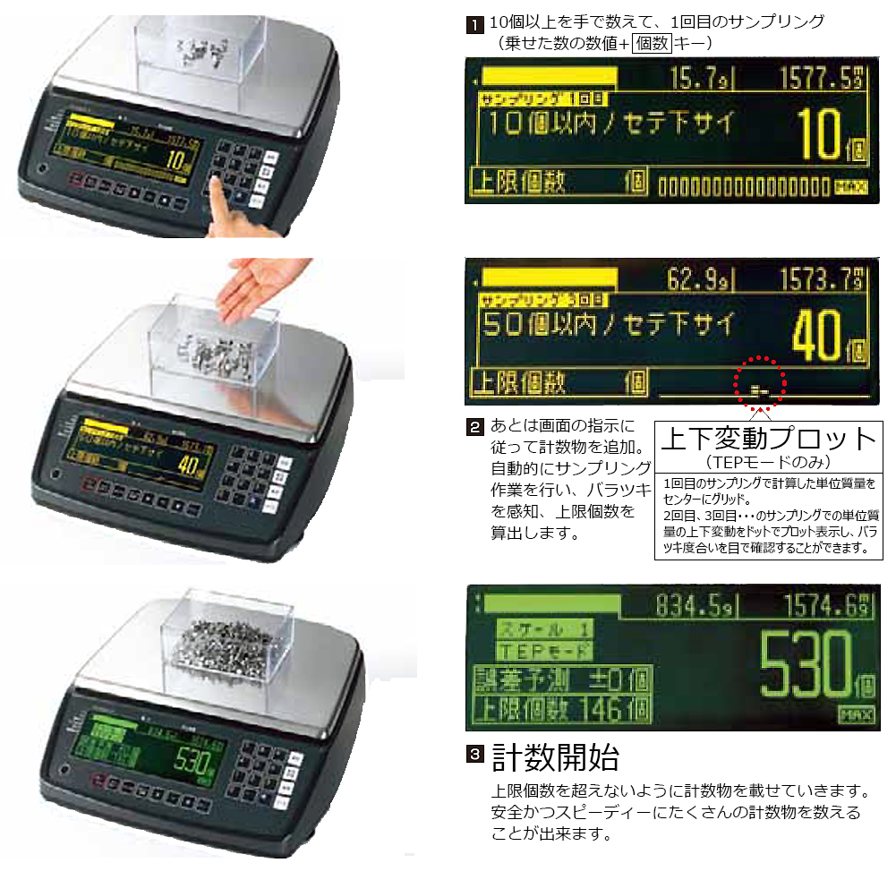 | ■特長 ●メーカー独自の計数方式採用で、バラツキの多い対象物の計数精度が格段に向上しました。 ●コンパクトでスタイリッシュな本体に大きく見やすい画面を搭載。 ●重量検出は従来のロードセルセンサータイプと、より精密なワイドレンジセンサータイプから選べます。 ●最大4スケールまでの接続に対応し、RS-232C出力で計数データをPCや外部プリンターに送信できます。 ■機能 ●TEPモード操作 サンプリング作業を自動でオペレーティング。 計量物のばらつきを内部で感知。誤差の出にくい安全な計数作業が行えます。 ![]() ●誤差予測表示 ![]() ■寸法図 ![]() ![]() ■仕様