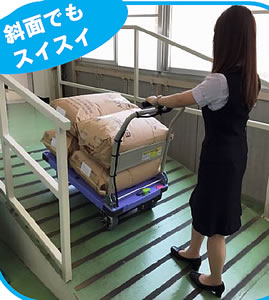 | ■特徴 ●300kgまで積載可能。 ●スロープ・坂道の運搬が圧倒的に楽になります。 ●軽量で取り扱いが簡単。 ●折り畳みが出来るので省スペースで保管可能。 ●音も静かで周囲に気兼ねなく使えます。 ●電源OFFでも通常台車として使用できます。 ■安全性に配慮 ●停車時ペダルを踏むだけで確実に車輪がロックするスペシャルブレーキを搭載。 ●急発進防止機能付。電源ON直後は、スロットルを回してもモーターは動きません。 ●スロットルを離すと電磁ブレーキがかかります。斜面でも安全にご利用いただけます。 ●走行状況に合わせ、2段階のスピード設定が可能。 ●天板の四隅にコーナーバンパーが標準装備されています。 ■金型や鉄材などの重量物の運搬を、安全に無理なくアシストします。 ![]() ■バンパー標準装備 天板の四隅に装備されたコーナーバンパーで追突時の衝撃を和らげます。 ![]() ■安心のスペシャルブレーキ 解除時に蹴り上げ動作がなく、ペダル操作もらくらく。 また、ブレーキのON・OFFを一目で確認できるため、ブレーキの掛け忘れを解消します。 ![]() ■使い方は簡単