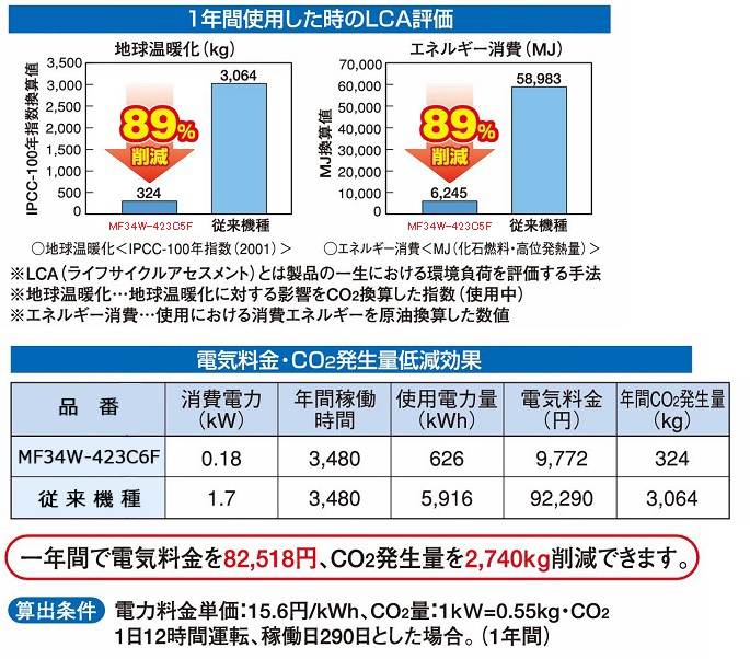 | ■特長 ●150W※1で風速1mの風を35m先まで送ることができます。 ●50Hz/60Hz専用設計で、日本のどこでも同一性能。 ●仰角90度の送風が可能で、効果範囲・用途が拡大。 ![]() ●性能はそのままで、設置面積を削減。 ●新型可変オフタイマ内蔵で、作業終了時の切忘れ防止。 (MF34W-413EPCは除く) ●前部安全ガードを標準化。(MF34W-413EPCを除く) ●52dBの低騒音。 ●三相200V、単相100Vに加え、耐圧防爆モータ仕様をラインナップ。 ![]() ■評価&効果 ![]() ![]() ■仕様