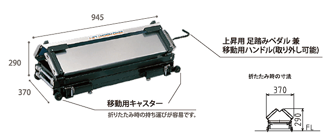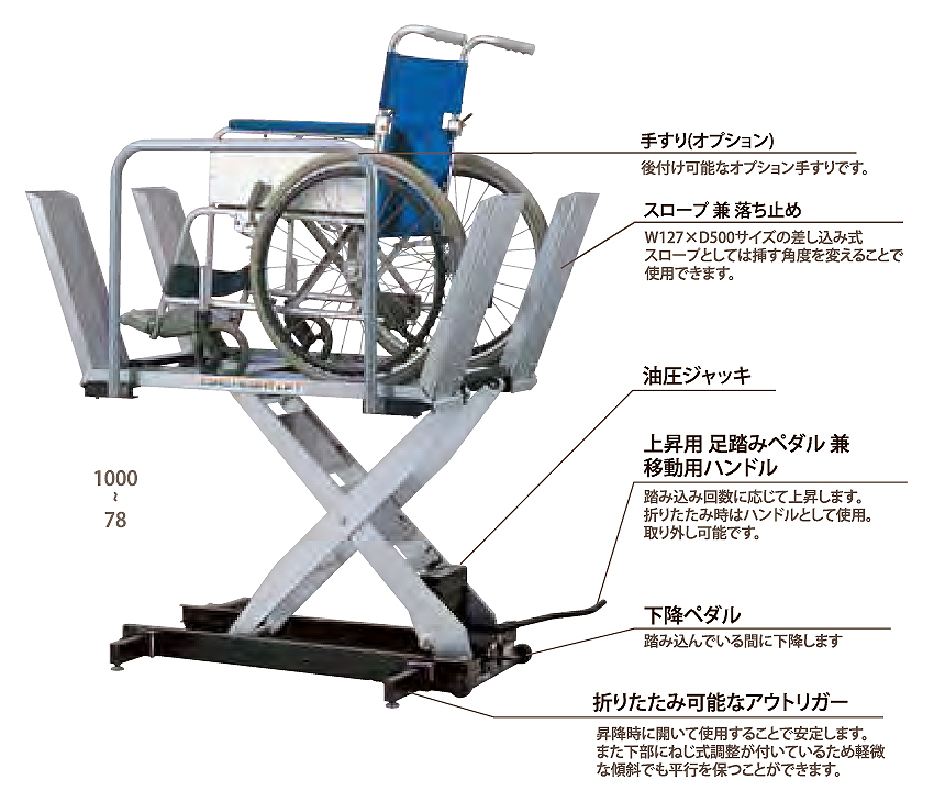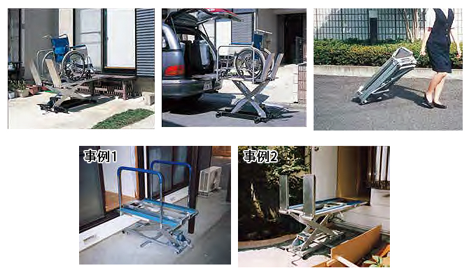 どこでも持ち箱で使用できる、電源不要の段差解消足踏み式リフト。 |